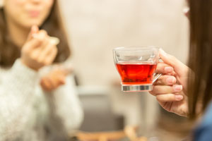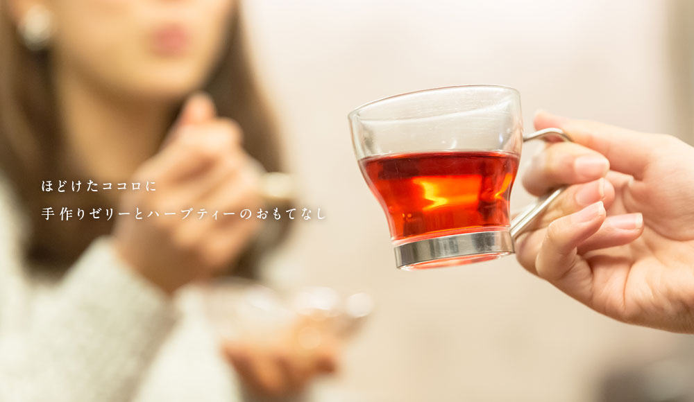 岩盤浴とよもぎ蒸しで、ココロもカラダもほぐれたお客様にほどらひ特製、手作りゼリーとハーブティーのサービスを。