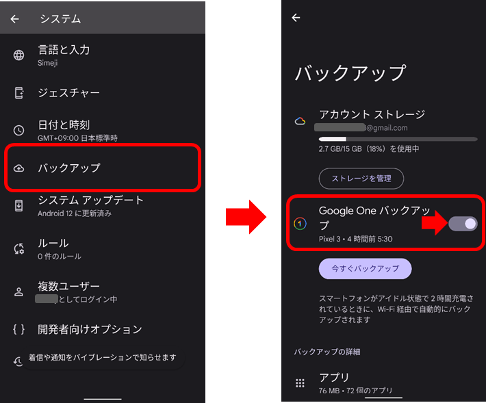 ②.次に【バックアップ】を選択⇒GoogleOneバックアップをオンにします。